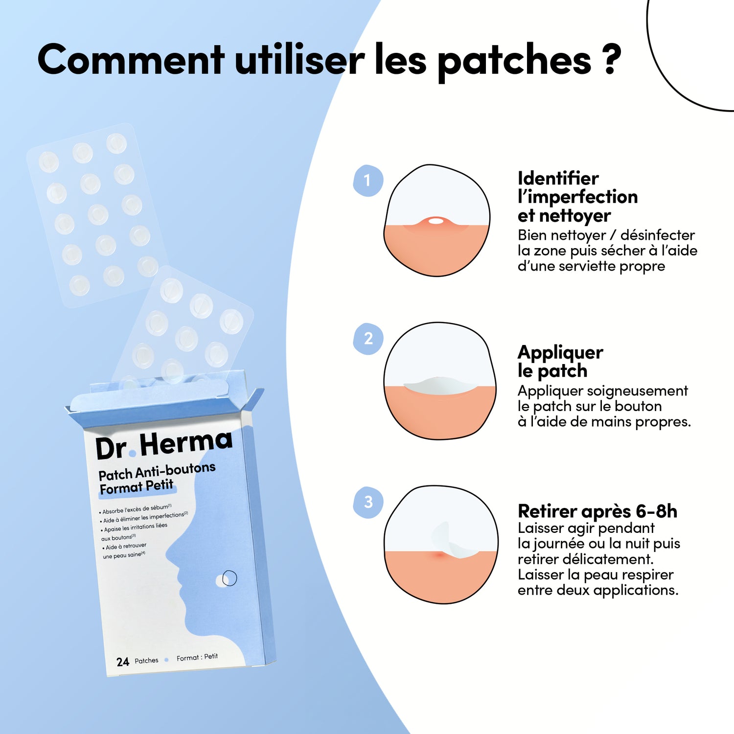 Ravie de l'efficacité J'ai acheté les patchs suite à un changement de routine soins qui a fait apparaître pas mal de boutons. Les patchs Dr. Herma sont vraiment bons.