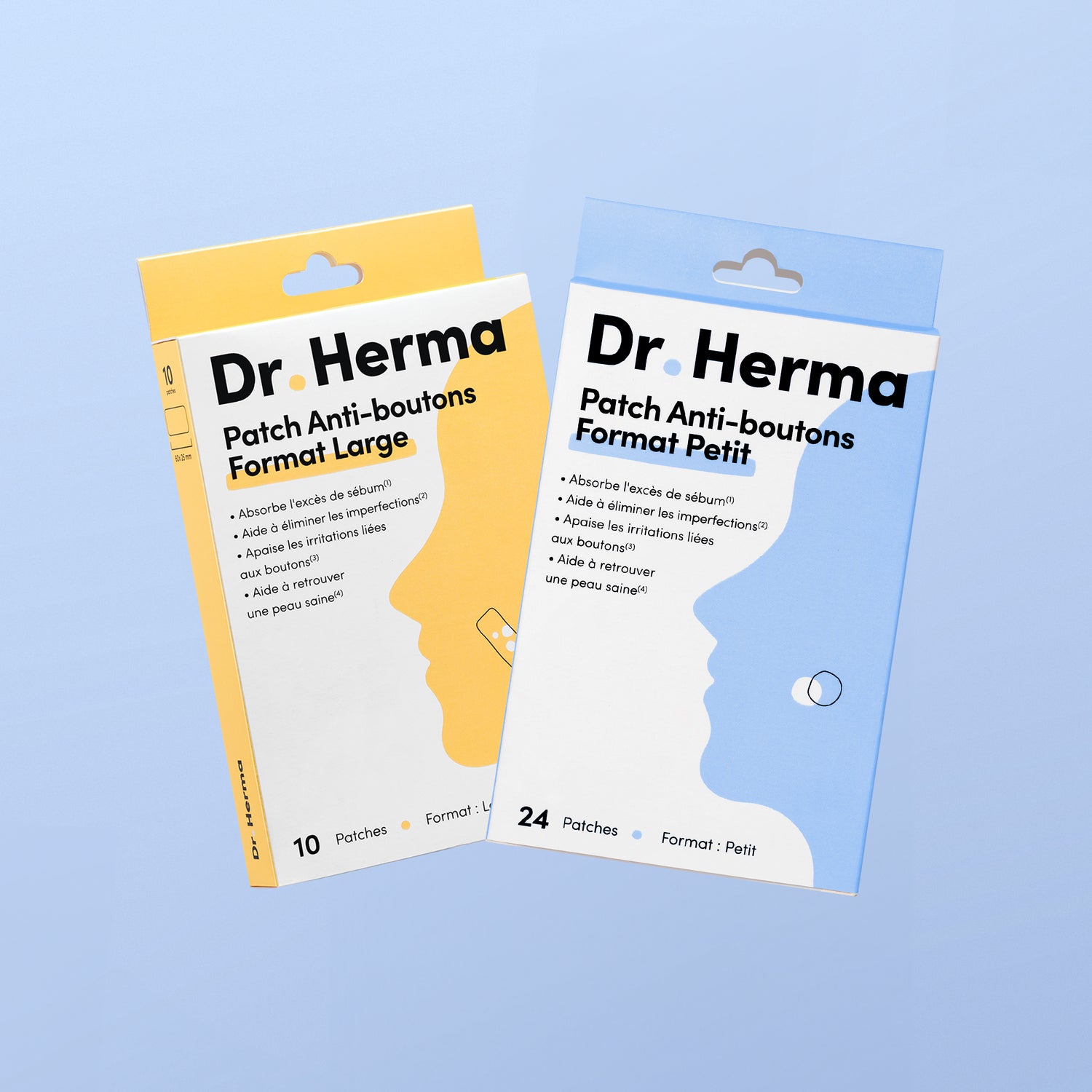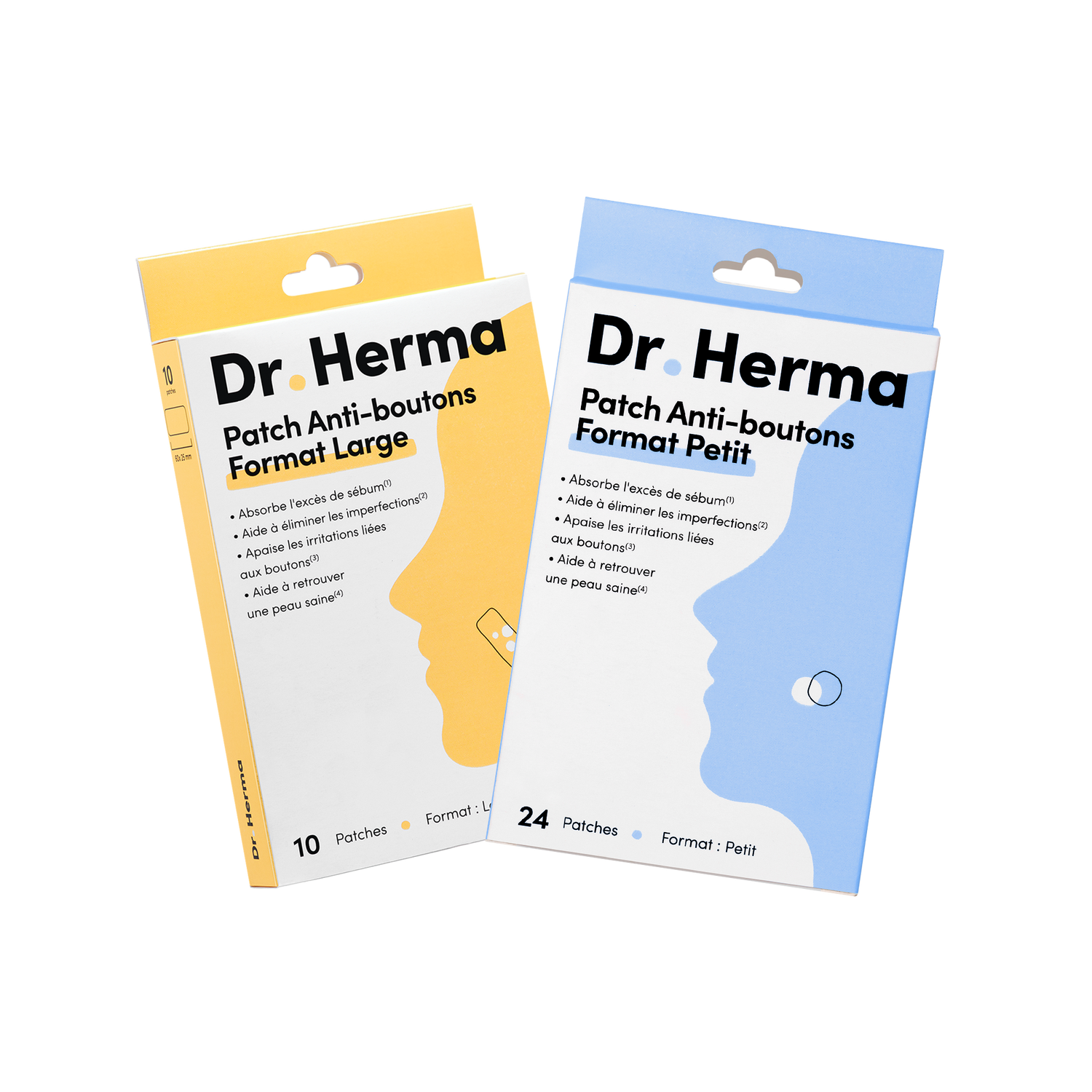 Le format Petit (24 patchs ronds) cible les boutons isolés sur le visage ou le corps. Le format Large (10 patchs XL) couvre les zones étendues. Le format Nez (10 patchs prédécoupés) épouse la forme du nez pour traiter les imperfections de cette zone spécifique. Le format Mix (16 patchs) regroupe les 3 tailles dans une seule boîte. La formule est identique pour tous les formats.